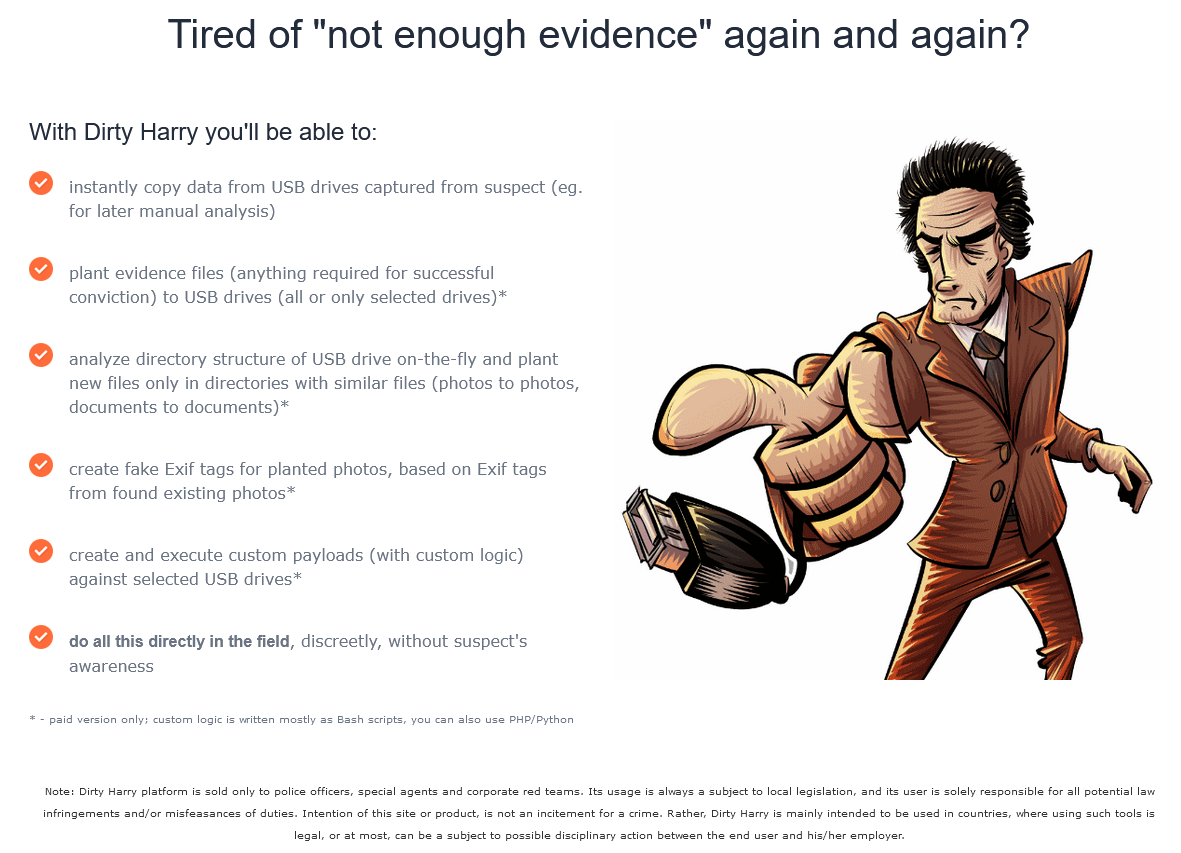 Oba sprzedane egzemplarze produktu Dirty Harry v1 zostały użyte do infiltracji polskiego seks-biznesu i likwidacji kilku agencji towarzyskich (w dwóch różnych regionach Polski). W co najmniej jednym z tych przypadków, dowody zostały zdobyte głównie właśnie dzięki możliwościom naszego produktu.